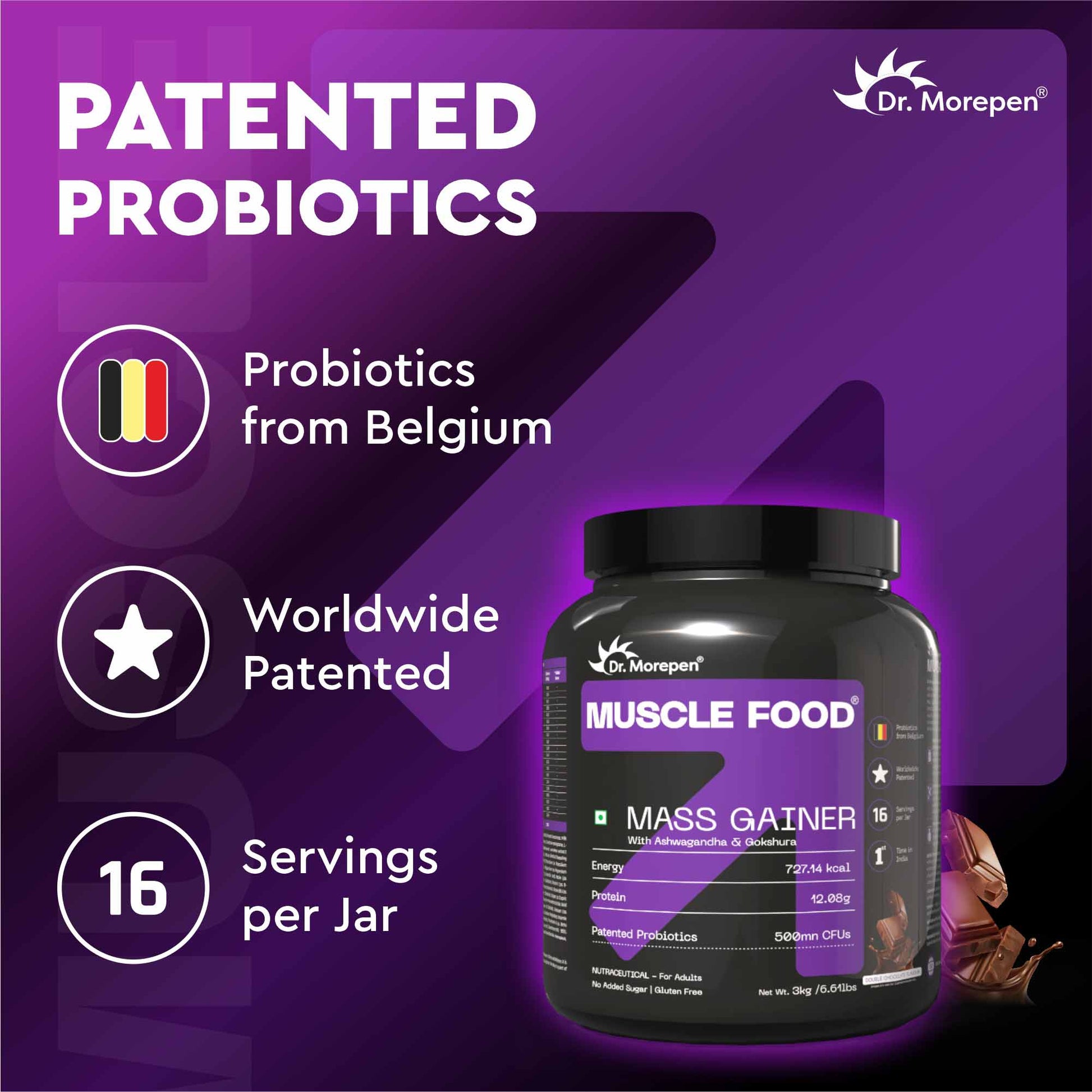 Maltodextrin, Medium Chain Triglycerides, Milk Protein Concentrate, Milk Solids, Casien and Caseinates,Whey Protein Concentrate, Creatine monohydrate, LGlutamine, Cocoa powder, Whey protein isolate, Withania somnifera extract(Ashwagandha), Tribulus terrestris extract (Gokshura), Nature identical flavouring substance(Chocolate), Vitamins and minerals blend [Potassium (as Potassium Dibasic Phosphate), Calcium (as Calcium Carbonate), Magnesium (as Magnesium Oxide), Choline(as Choline Barbiturate), Vitamin C (L-Ascorbic acid), Niacin (as Nicotinamide), Iron (as Ferrous Sulphate), Zinc (as Zinc Sulphate), Vitamin E (as D-alpha Tocopheryl Acetate), Vitamin B5 (as Calcium DPantothenate), Vitamin B6 (as Pyridoxine Hydrochloride), Manganese (as Manganese Chloride), Copper (as Cupric Sulphate), Vitamin B2 (as Riboflavin), Vitamin B1 (as Thiamine Mononitrate), Folic Acid (as NPteroyl-l-Glutamic Acid), Chromium (as Chromium III Chloride), Selenium (as Sodium Selenite), Biotin (as DBiotin), Molybdenum (as Sodium Molybdate), Vitamin B12 (as Cyanocobalamin), Vitamin A (as Retinyl Palmitate), Provitamin A (as Beta Carotene ) and Vitamin D2 (as Ergocalciferol - Plant Source)], Sweetener (INS 955), Common salt, Stabilizer (INS 415), Probiotic blend (Lacticaseibacillus rhamnosus, Bifidobacterium lactis) and Anticaking agent (INS 551) Chloride), Copper (as Cupric Sulphate), Vitamin B2 (as Riboflavin), Vitamin B1 (as Thiamine Mononitrate), Folic Acid (as NPteroyl-l-Glutamic Acid), Chromium (as Chromium III Chloride), Selenium (as Sodium Selenite), Biotin (as D-Biotin), Molybdenum (as Sodium Molybdate), Vitamin B12 (as Cyanocobalamin), Vitamin A (as Retinyl Palmitate), Provitamin A (as Beta Carotene ) and Vitamin D2 (as Ergocalciferol - Plant Source)], Sweetener r (INS 955), Common salt, Stabilizer (INS 415), Probiotic blend (Lacticaseibacillus rhamnosus, Bifidobacterium lactis) and Anticaking agent (INS 551)